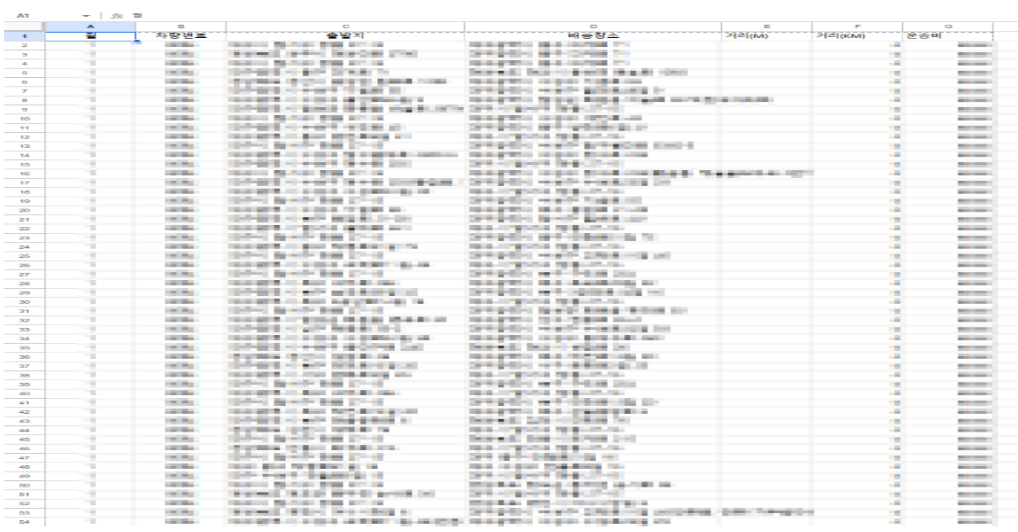 출발지와 도착지가 정리된 엑셀 파일을 기준으로, 이동 거리를 계산하고 KM당 운송비를 산정하는 일이었습니다. 계산 기준 자체는 명확했지만, 실제 업무 과정은 생각보다 손이 많이 가는 편이었습니다.